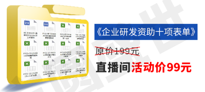 刘老师也将结合《企业研发资助十项表单》的归集表单做详细的分析,帮助企业能在实践中有更明确的指标方向。如何更好地申报企业的研发资助,除了要准时收看这场精彩的课程,详细的《企业研发资助十项表单》也不能错过哦!这里已将申请研发资助的所有表单进行了统一归集,表单当前售价仅需99元!直播结束后将调整价格!