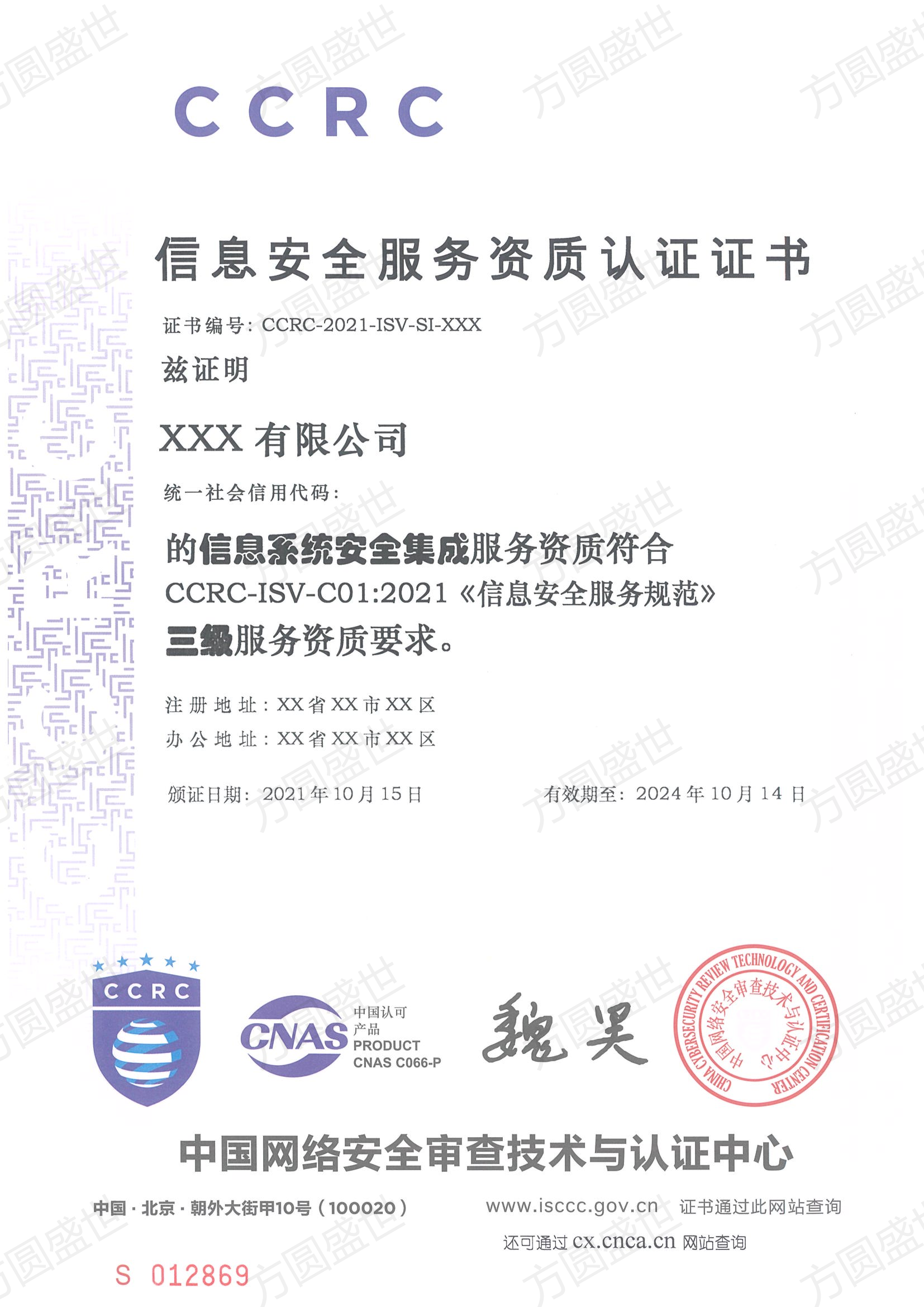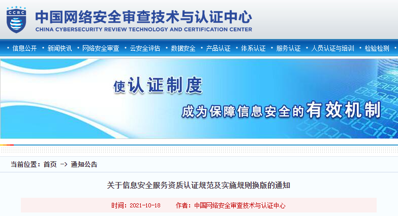 中国网络安全审查技术与认证中心(CCRC)对服务资质认证规范及实施规则进行了修订,于2021年10月15日发布了2021版CCRC-ISV-C01:2021《信息安全服务规范》、CCRC-ISV-R01:2021《信息安全服务资质认证实施规则》,并从发布之日起正式实施。自当日起,CCRC启动按照新版认证实施规则的认证申请受理工作,不再受理依据旧版认证实施规则的认证申请。