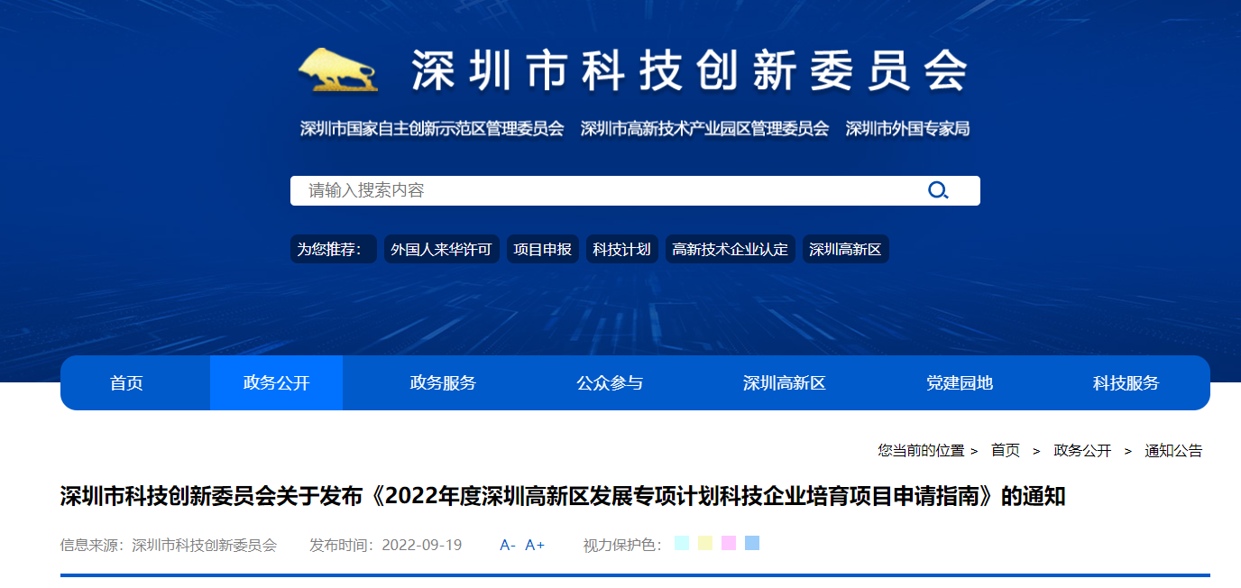《2022年度深圳高新区发展专项计划科技企业培育项目申请指南》的通知