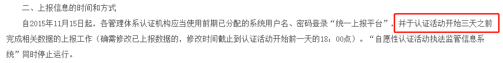根据《国家认监委关于运行自愿性认证活动执法监管信息上报平台的通知》,认证活动开始三天之前,于“认证认可业务信息统一上报平台”完成相关数据的上报工作。