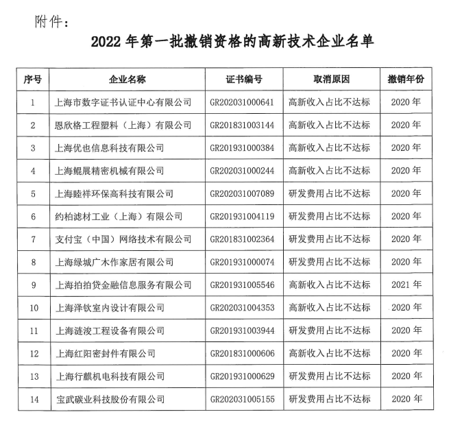 上海市高新技术企业认定指导小组公告近期了2022年第一批撤销高新技术企业资格企业名单,撤销年份在2020年和2021年,包括支付宝(中国)网络科技有限公司(以下简称“支付宝(中国)”)在内的14家企业。其中,支付宝(中国)被取消高新技术企业认定的原因为,“研发费用占比不达标”,撤销年份为2020年。