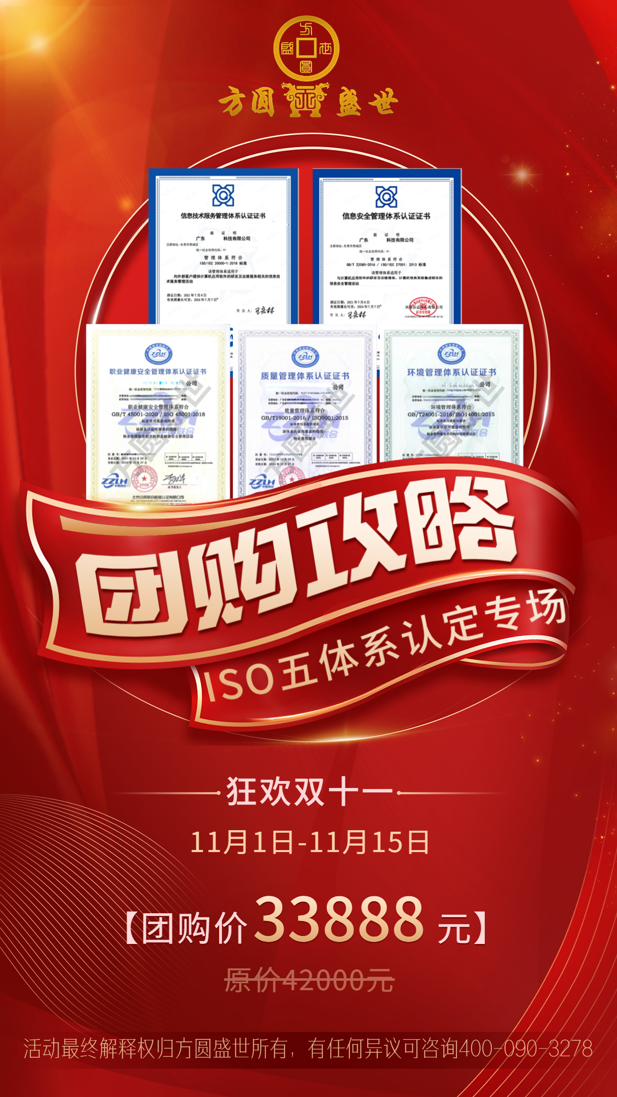 双十一大促活动,体系认证专场让您的企业全面提升!这不止是一笔消费,更是对企业未来的投资!现在全年已是最低价!优惠名额有限,活动随时截止,有意可在线咨询方圆盛世相关业务人员,我们将竭诚为您服务。