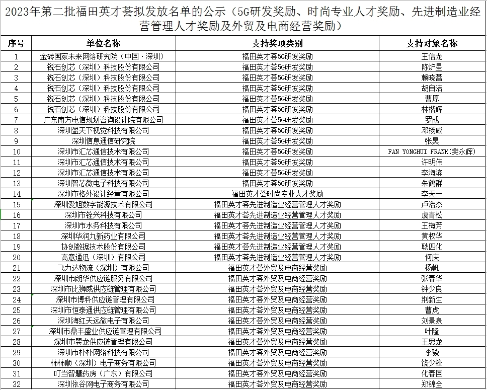 附件:2023年第二批福田英才荟拟发放名单的公示(5G研发奖励、时尚专业人才奖励、先进制造业经营管理人才奖励及外贸及电商经营奖励)