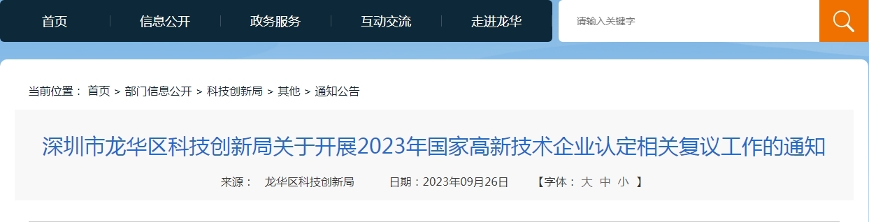 深圳市2023年国家高新技术企业认定第五批次申报工作即将结束,根据深圳市科技创新委员会有关通知要求,龙华区科技创新局负责受理2023年龙华区国家高新技术企业认定复议推荐相关工作,现将有关事项通知如下: