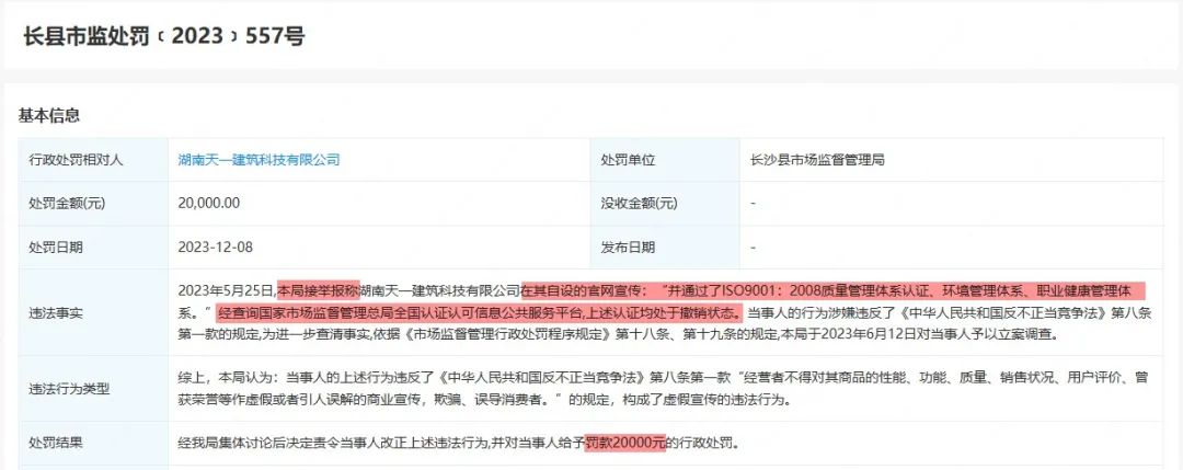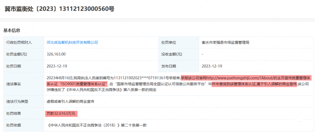 全国范围内,多地市场监管局发布行政处罚决定书,针对在企业官网或其他外部渠道宣传本企业已通过ISO9001认证或本企业产品已经通过ISO认证,而实际认证证书已经是撤销状态或者失效状态,多家企业遭受举报,并因此受到行政处罚,最高被罚款超过32万元。