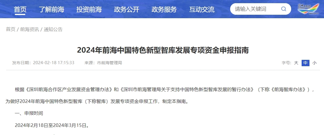 根据《深圳前海合作区产业发展资金管理办法》和《深圳市前海管理局关于支持中国特色新型智库发展的暂行办法》(下称《前海智库办法》),为做好2024年前海中国特色新型智库(下称智库)发展专项资金申报工作,制定本指南。