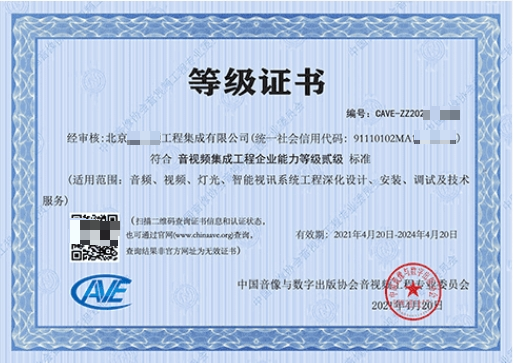 1、资质名称:音视频集成工程企业【能力等级证书】。