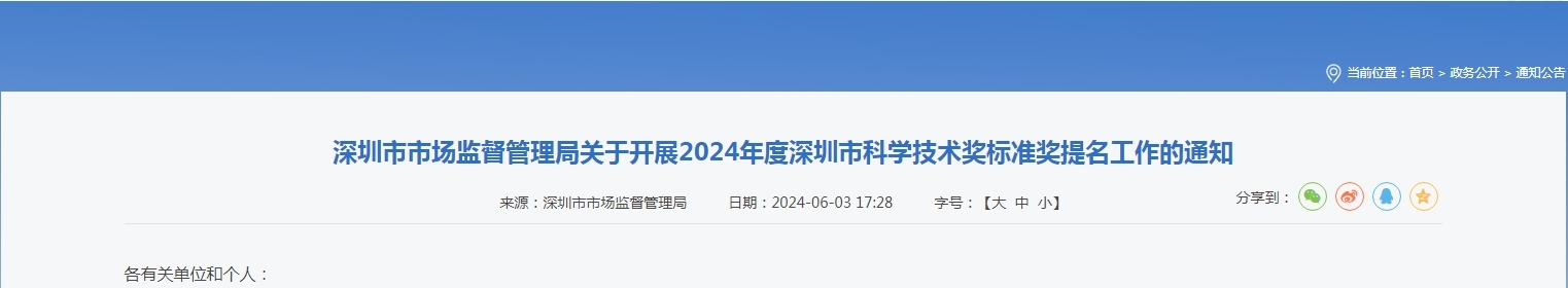 2024年度深圳市科学技术奖标准奖,奖项不分等级,授奖总数不超过15项。
