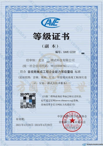 其中,中国音像与数字出版协会音视频工程专业委员会颁发的证书是针对从事音频、视频、灯光、智能视讯系统集成工程的深化设计、安装、调试及维修服务等综合技术能力等级的评定;