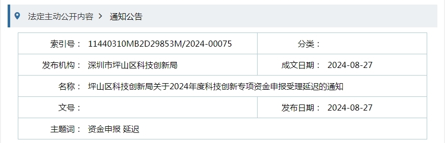 坪山区科技创新局关于2024年度科技创新专项资金申报受理延迟的通知