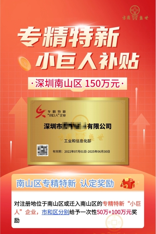除了领取南山区的补贴,同时还能叠加拿到深圳市的专精特新“小巨人”企业认定奖励。合计就能达到150万元