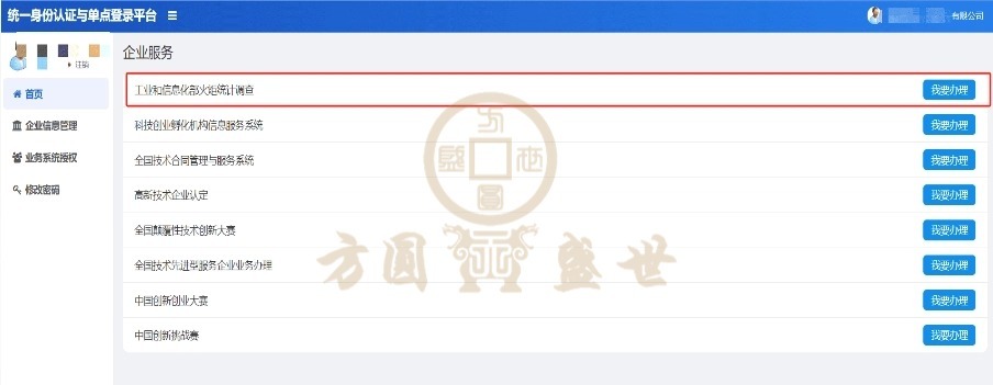 2、登录后,进入“企业服务”菜单,选择“工业和信息化部火炬统计调查”事项,点击“我要办理”