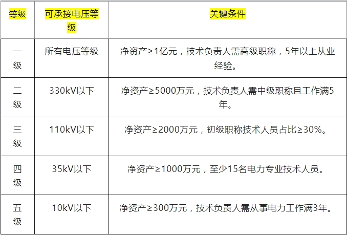 技术负责人:需具备电力专业中级以上职称,且从事电力相关工作满5年。