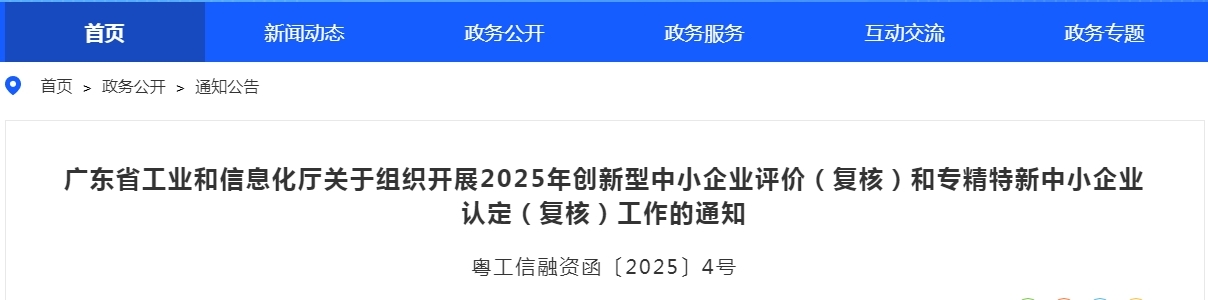 根据《广东省优质中小企业梯度培育管理实施细则》(粤工信规字〔2024〕5号,以下简称《细则》)规定,现组织开展2025年创新型中小企业评价(复核)和专精特新中小企业认定(复核)工作。有关事项通知如下: