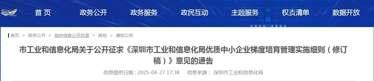 为加强优质中小企业梯度培育工作,根据《优质中小企业梯度培育管理暂行办法》(工信部企业〔2022〕63 号),我局对2022年11月印发的《深圳市工业和信息化局优质中小企业梯度培育管理实施细则》(深工信规〔2022〕7号)进行修订,现公开征求社会公众意见。