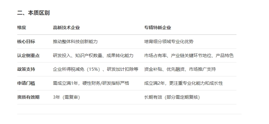 高新技术企业认定与专精特新企业认定是中国为鼓励企业创新和专业化发展推出的两类重要资质,其适用对象、核心目标及政策支持各有侧重。以下是两者的对比分析及选择建议: