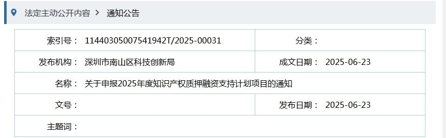 (五)申报主体需于上年度在国家知识产权局完成质押登记,且质押登记申请表的出质人地址在南山区。用于质押登记的知识产权合法有效、权属清晰、法律状态明确;