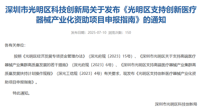 (三)《深圳市光明区支持高端医疗器械产业集群高质量发展扶持计划操作规程》(深光工信规〔2023〕4号)。