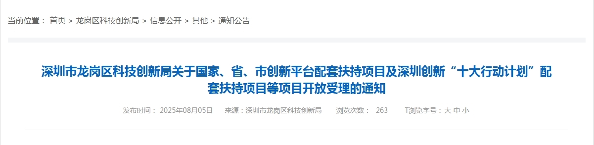 根据《深圳市龙岗区科技创新局关于印发〈深圳市龙岗区科技创新专项资金实施细则〉的通知》(深龙科规〔2024〕1号)规定,我局现统一开放受理18个项目,现将有关申报事项通知如下: