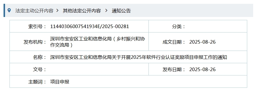 深圳市宝安区工业和信息化局关于开展2025年软件行业认证奖励项目申报工作的通知