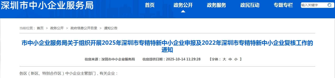 根据《优质中小企业梯度培育管理暂行办法》(工信部企业〔2022〕63号)和《深圳市工业和信息化局优质中小企业梯度培育管理实施细则》(2025年修订版)(深工信规〔2025〕8号)相关规定,我局组织开展2025年深圳市专精特新中小企业申报及2022年深圳市专精特新中小企业复核工作。有关事项通知如下:
