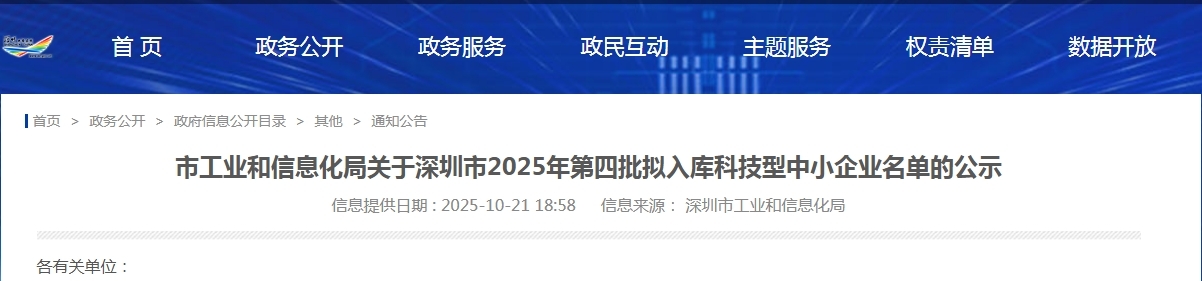 根据《科技型中小企业评价办法》(国科发政〔2017〕115号)和《科技型中小企业评价服务工作指引》(国科火字〔2022〕67号)有关规定,现将深圳市2025年第四批6324家拟入库科技型中小企业名单(详见附件)予以公示,公示时间自2025年10月22日—2025年11月4日。公示期间如有异议,请以书面形式(注明通讯地址和联系方式)向我局反映,受理单位:市工业和信息化局高新区发展处,地址:深圳市福田区福中三路市民中心C区3070室,邮编:518035,电话:88102087、88102613。